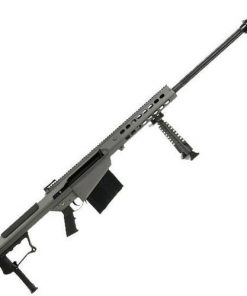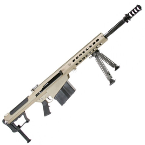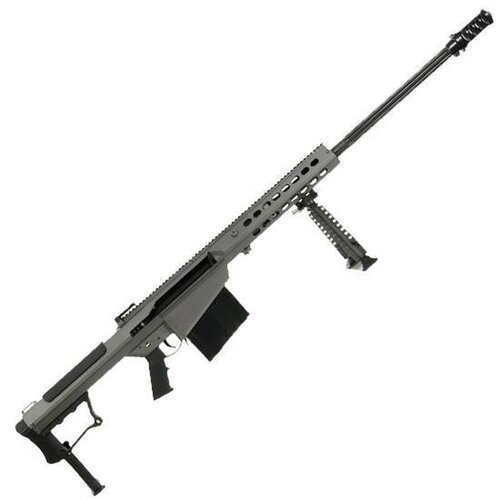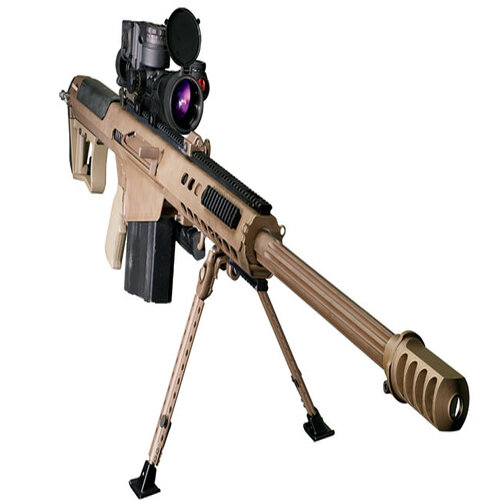 The Barrett model M107A1 .50 BMG rifle system is a semi-auto action rifle with a 29″ chrome-lined barrel with a suppressor ready muzzel break. Included is a pelican case, one 10-round magazine, 18 inch optical rail with a 27 MOA tapper, detachable adjustable bipod legs, monopod, back-up iron sight and owner’s manual.