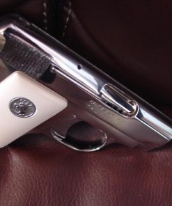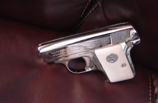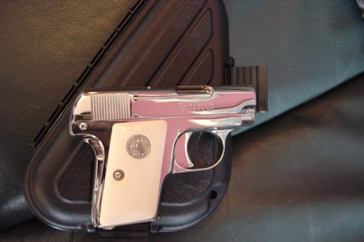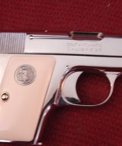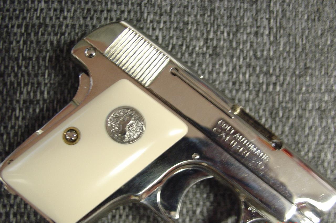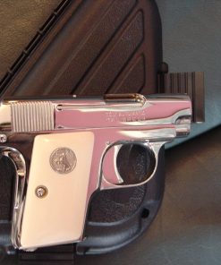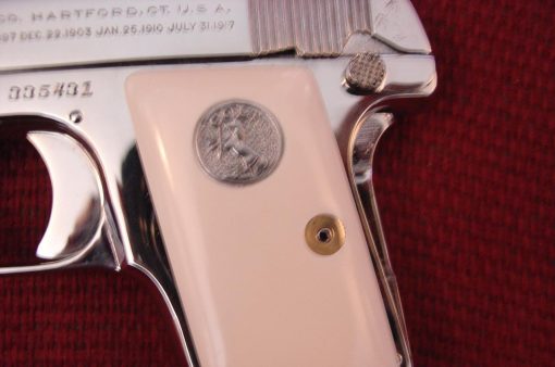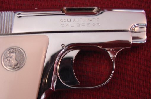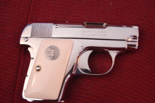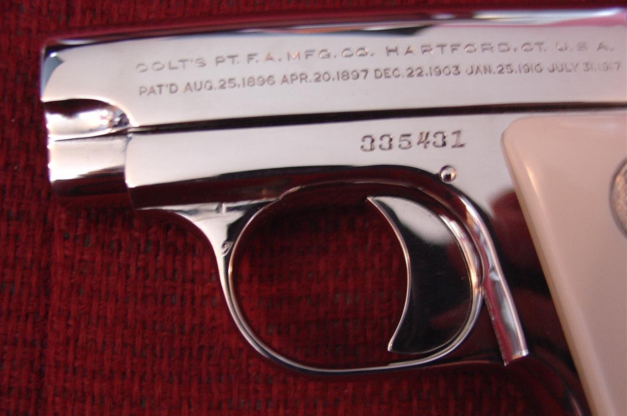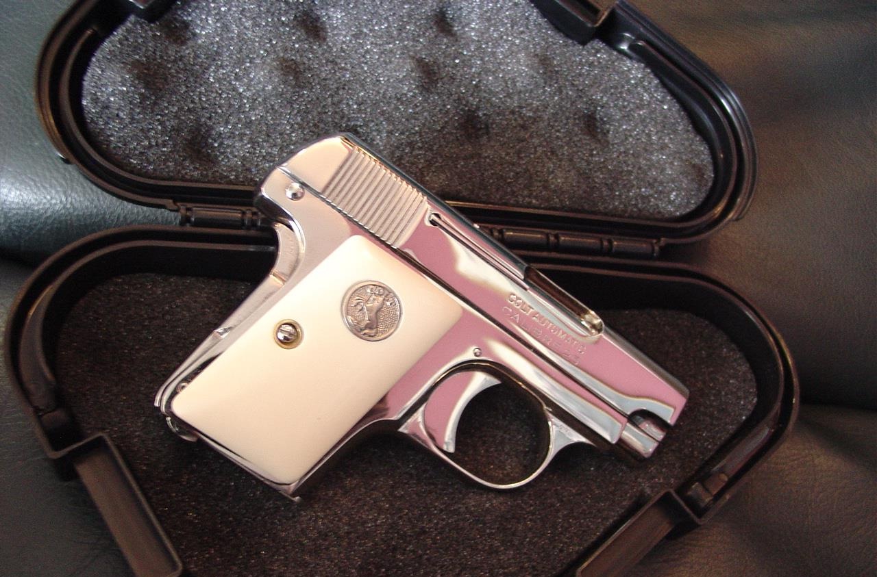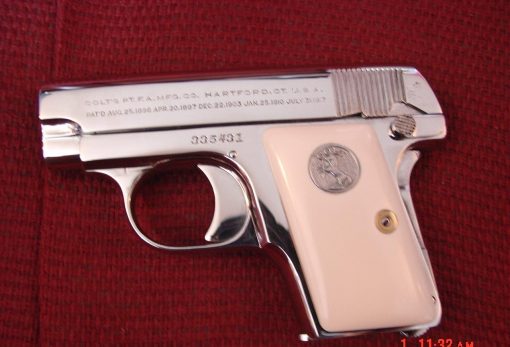 here is a nice Colt Vest Pocket Hammerless,in 25 caliber,semi automatic,& made in 1923,so it now 93 years old,& was fully refinished in bright mirror nickel & done in Nov.2016,& has really nice creamy yellowed bonded ivory grips-not white like in some photos.hides in the palm of your hand, and has a grip safety. comes with a cool triangle shape padded hard case. serial # 335431