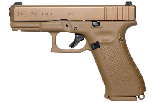 Glock 19X 9mm – GLOCK’s first ever “Crossover” pistol, the GLOCK 19X, combines the best features of two of its most popular and most trusted field-tested platforms. The full-size GLOCK 17 frame and the compact GLOCK 19 slide have joined forces to produce the ideal pistol for all conditions and all situations. The 19X comes in the coyote color with the first-ever factory colored slide, finished with a nPVD slide coating to prevent corrosion.