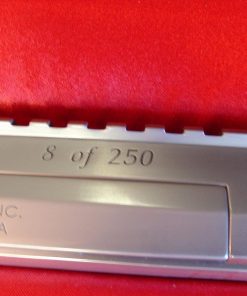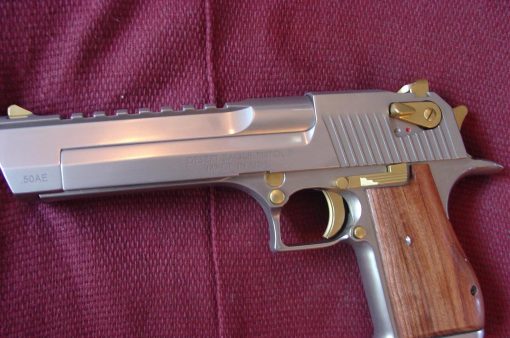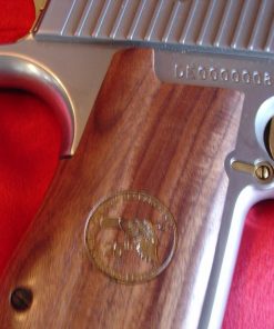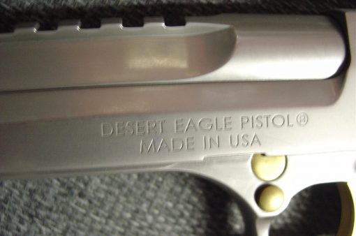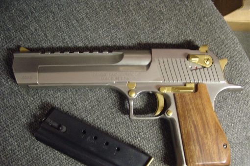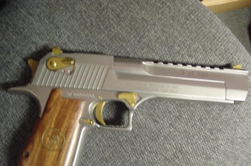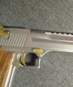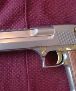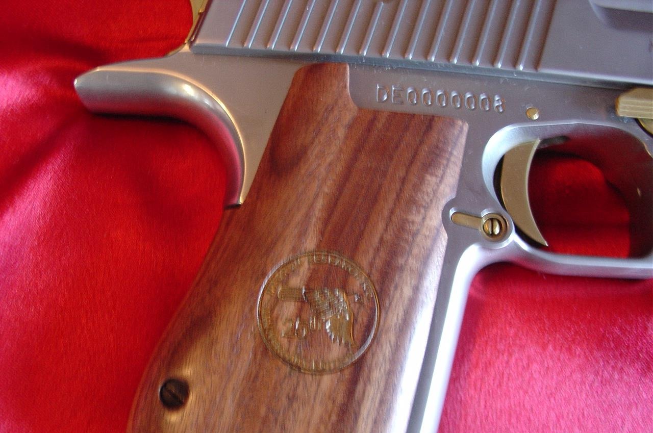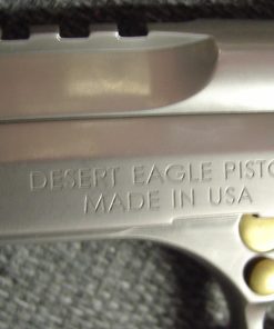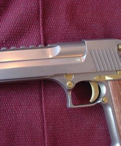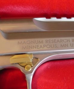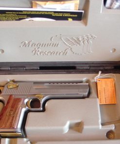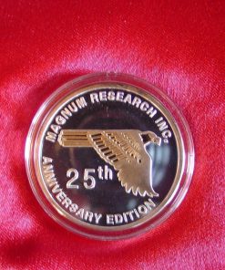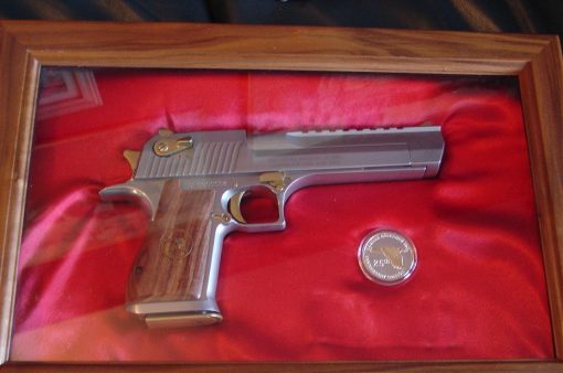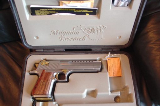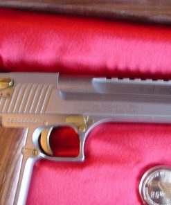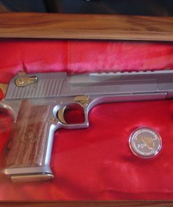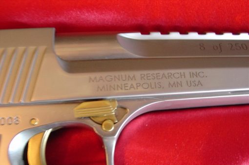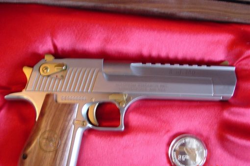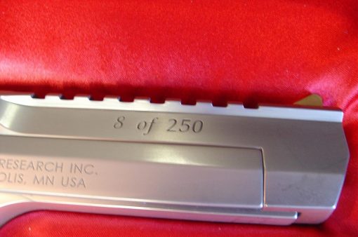 Here is one of the rarest Desert Eagle hand cannons I have ever had or seen. its the 25 Anniversary special edition model made in 2010 only, in Titanium silver with gold accent & is #8 of only 250 ever made & its from Magnum research in the powerful 50 AE caliber,with 6″ barrel, custom wrap around walnut grips with the Desert Eagle logo,top accessory rail,ambidextrous safety, 1 oz pure silver 25th anniversary coin with gold eagle in the middle,& comes in the original hard padded carry case with serial #, & lock,DVD & owners manual etc etc, its brand new & unfired & also comes with a nice custom wood & glass presentation case with 2 locks & keys,& a small certificate for the coin also. it has a minor handling mark on the front of the frame,& price reflects