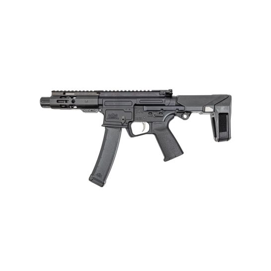 Lower: Forged 7075 T6 aluminum and then hard coat anodized, these lowers are purpose built to accept AR-V U9 and CZ Scorpion Magazines. The lower is assembled with a Palmetto State Armory MOE EPT PDW lower build kit with a Magpul Grip and SB Tactical HBPDW Pistol Stabilizing Brace.