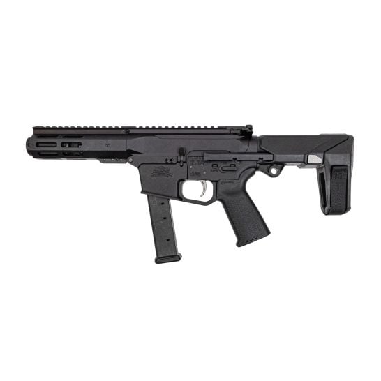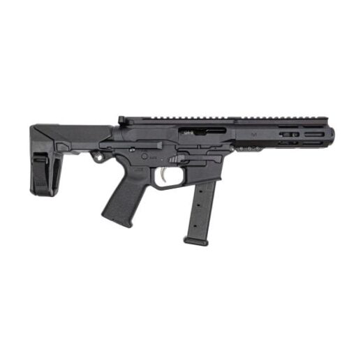 Lower: Forged 7075 T6 aluminum and then hard coat anodized, these lowers are purpose-built to accept 9mm Glock®-style magazines. The lower is assembled with a Palmetto State Armory MOE lower build kit with a Magpul MOE+ Grip, PSA Enhanced Polished Trigger (EPT), SB Tactical HBPDW Brace. Does not include last round bolt hold open feature.