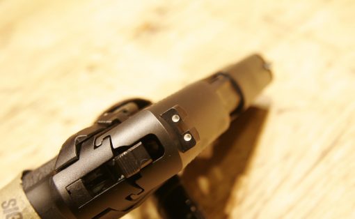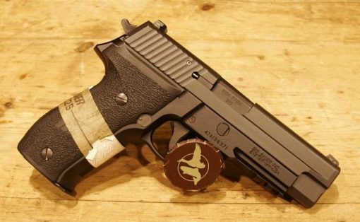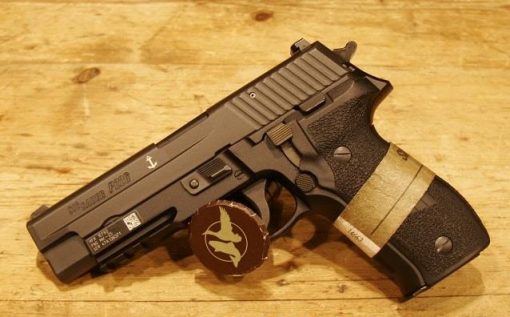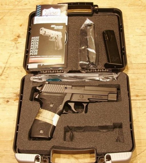 Sig Sauer P226 MK25 9mm. DA/SA. 4.4″ barrel. 34.4oz w/mag. SIGLITE night sights. Accessory M1913 rail. 15+1 capacity. Black polymer factory grips. Black hard anodized metal finish. UID label, anti-corrosion on controls and internal components, anchor engraving.