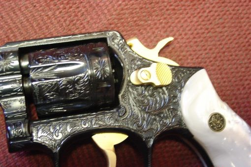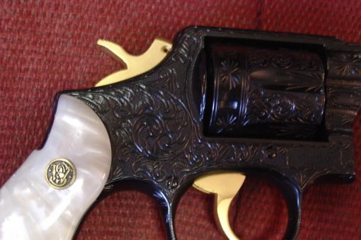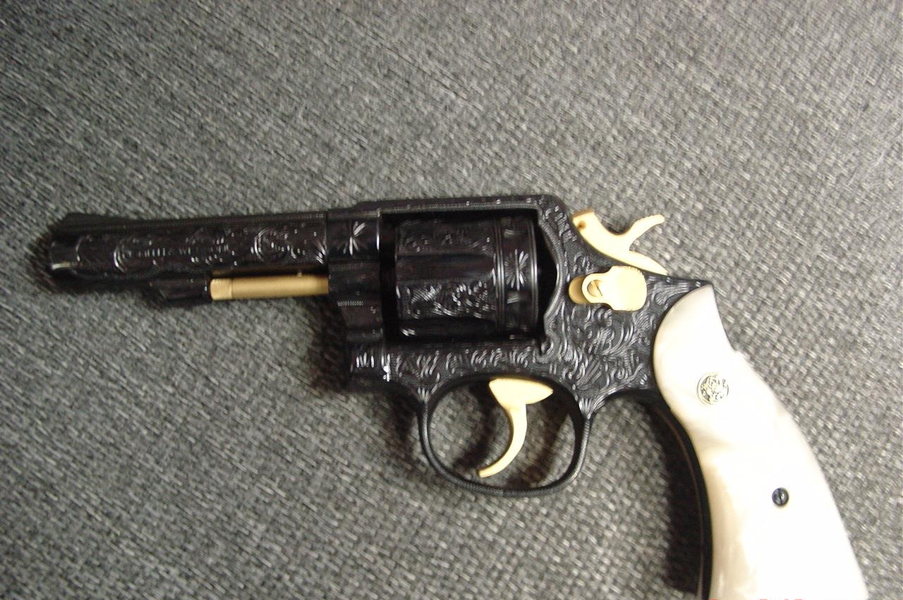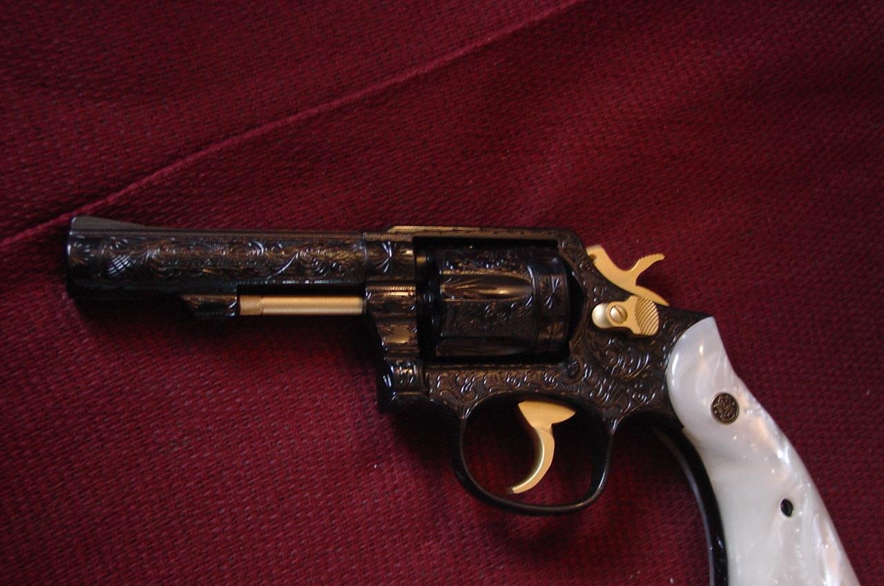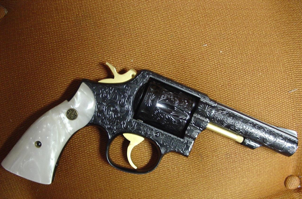Smith & Wesson model 10-8,4″,38 special,fully engraved,re-blued with gold accents by Flannery Engraving,Pearlite grips,& certificate. awesome showpiece.!!