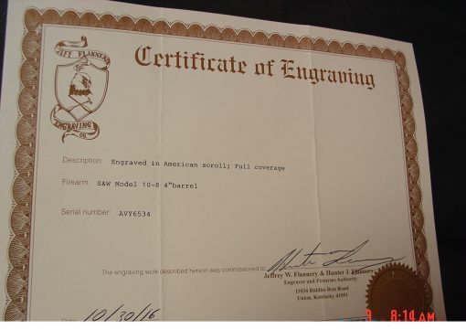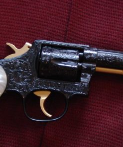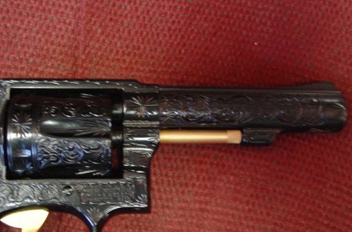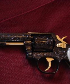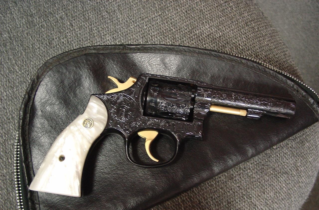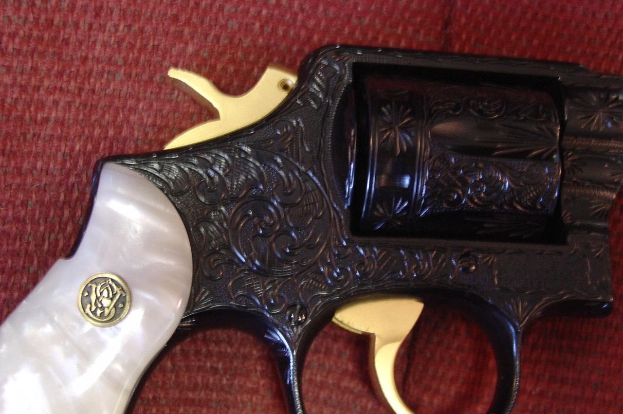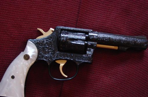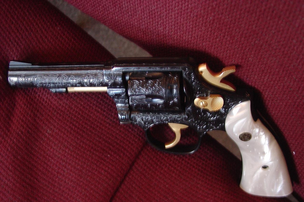 Smith & Wesson model 10-8,4″,38 special,fully engraved,re-blued with gold accents by Flannery Engraving,Pearlite grips,& certificate. awesome showpiece.!!