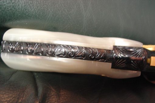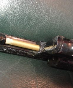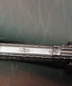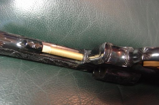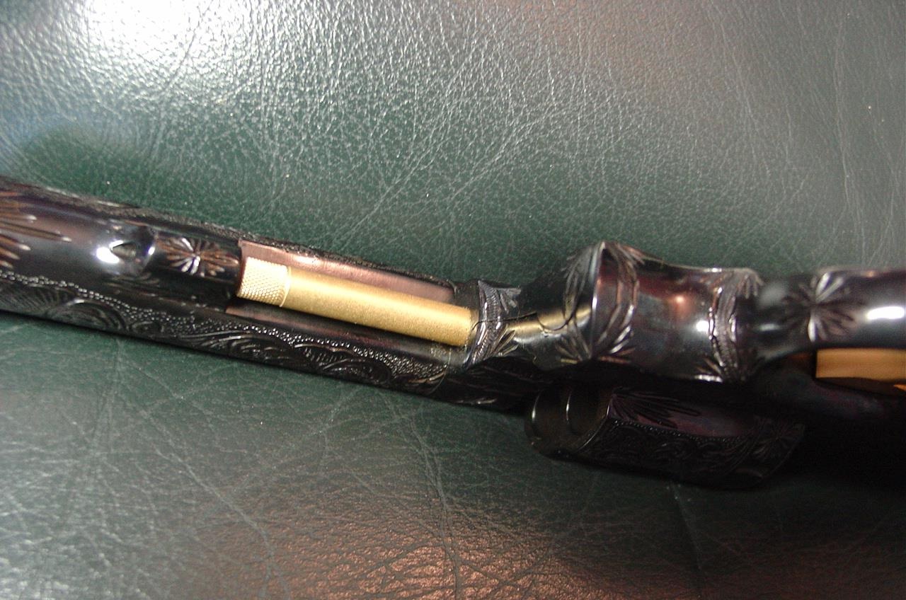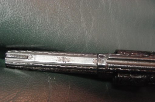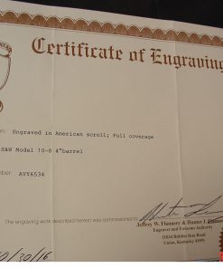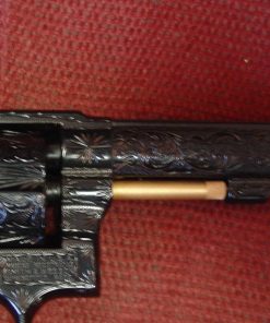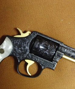 Here is another work of art from Flannery Engraving. S&W model 10-8 in 38 special, 4″ barrel, 6 shots, double or single action, and fully deep hand engraved by Hunter Flannery in American scroll,that looks way nicer in person, & has been refinished in bright blue with 24K gold accents, & even the end of the barrel is engraved, comes with nice colored Pearlite grips with gold S&W medallions. was just finished Oct 30th 2016 & has never been fired since it was redone. serial # AVY6534