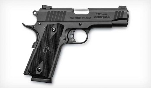 Taurus 191101COM 1911 Commander Single 45 Automatic Colt Pistol (ACP) 4.2″ 8+1 Black Polymer Grip Black The Taurus 1911 Commander has a shorter profile than traditional full-size 1911’s but maintains a full-size grip. Perfect for carrying, self-defense, or home use, the Commander features a monochromatic black on black finish, Novak drift adjustable front and rear sights, checkered black grips, and extended beavertail that offers comfortable shooting with great control. his model has a 4.2″ barrel and an 8-round magazine. SPECIFICATIONS: Mfg Item Num: 191101COM Category: PISTOLS Type :Pistol Action :Single Caliber :45 Automatic Colt Pistol (ACP) Barrel Length :4.2″ Capacity :8+1 Safety :Manual Grips :Black Polymer Sight Configuration :Novak Weight :38 oz Frame Finish :Black Frame Material :Steel Barrel Type : Slide Description :Black Case Type : Sight Style :Contrast